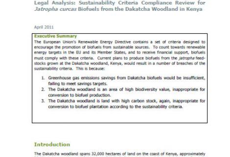 Current plans to produce biofuels from the jatropha feed-stocks grown at the Dakatcha woodland, Kenya, would result in a number of breaches of the sustainability criteria.