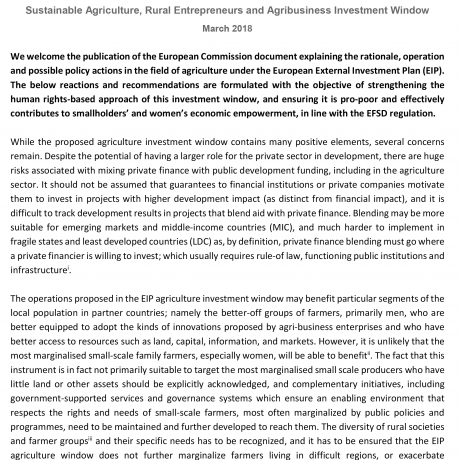 We welcome the publication of the European Commission document explaining the rationale, operation and possible policy actions in the field of agriculture under the European External Investment Plan